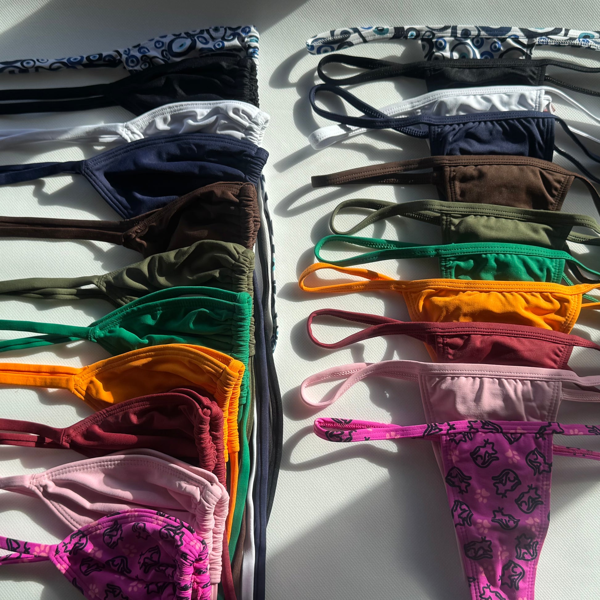 Branco, Preto, Licor de Uva, Marrom (Café Torrado), Azul Marinho, Rosa bebe (Rosa bailarina), Verde bandeira (Verde hortelã), Verde Musgo, Estampa rosa e preto gatinho.