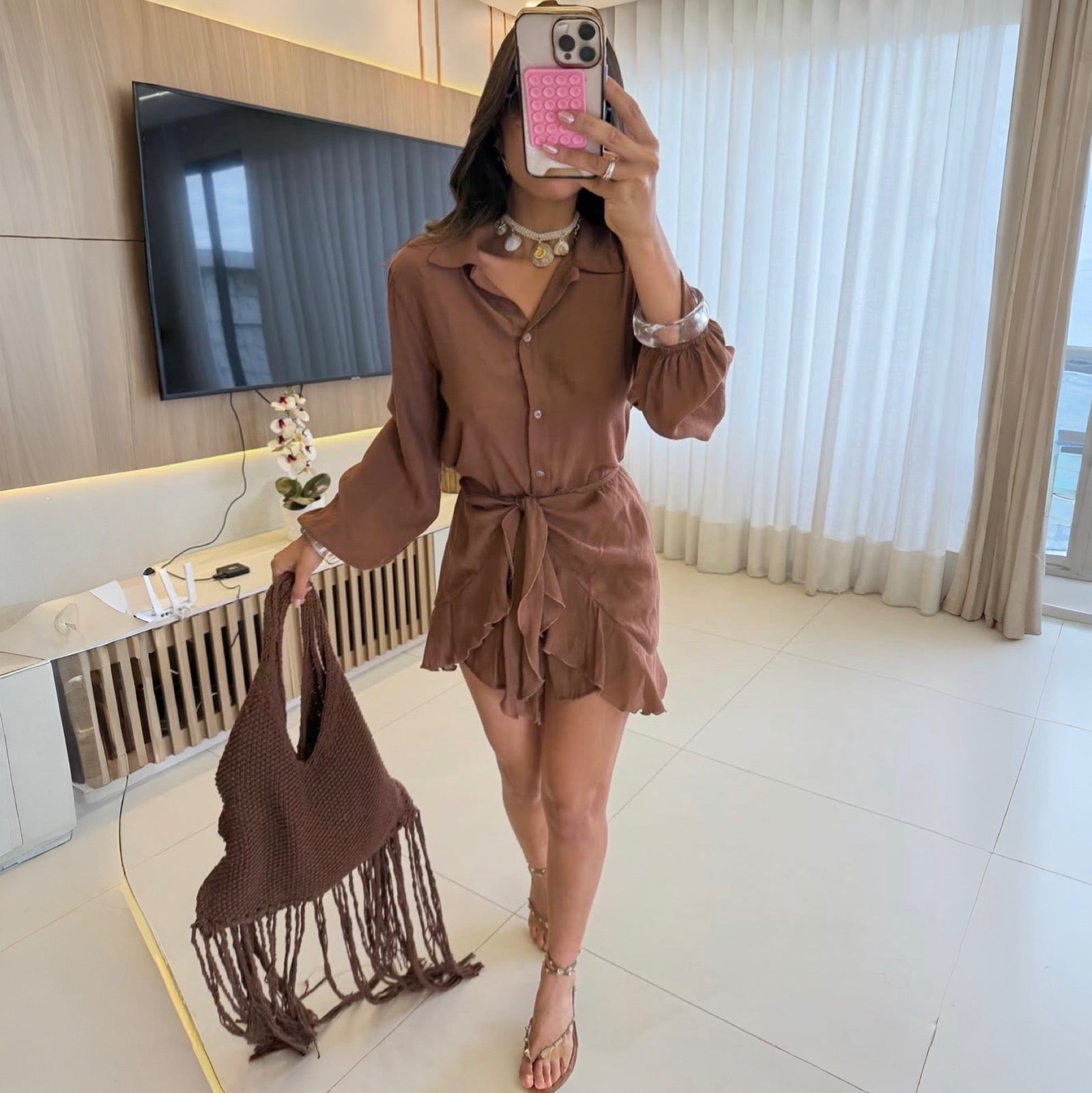 Disponível em cores que são puro desejo — off-white, marrom e branco —, o conjunto valoriza todos os tons de pele e combina perfeitamente com sandálias de tiras, rasteirinhas elegantes ou saltos blocos.