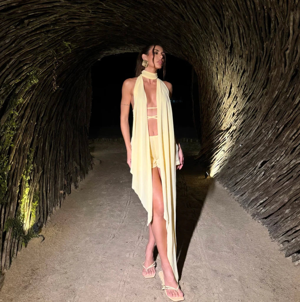 Conjunto sofisticado composto por top com recortes delicados, short de cintura alta e sobreposição longa e fluida. Uma peça elegante e moderna, com caimento leve que traz movimento e impacto visual, ideal para eventos especiais e produções refinadas.