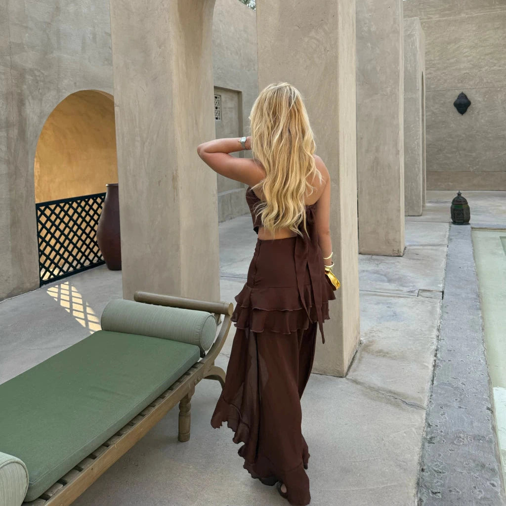 * O tecido em chiffon proporciona leve transparência e fluidez, ideal para composições sofisticadas em destinos quentes ou ocasiões especiais.
