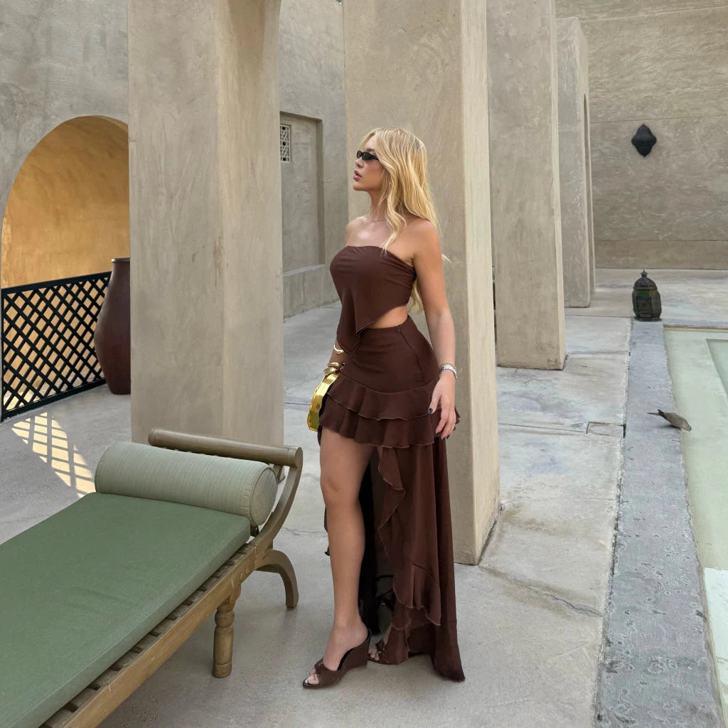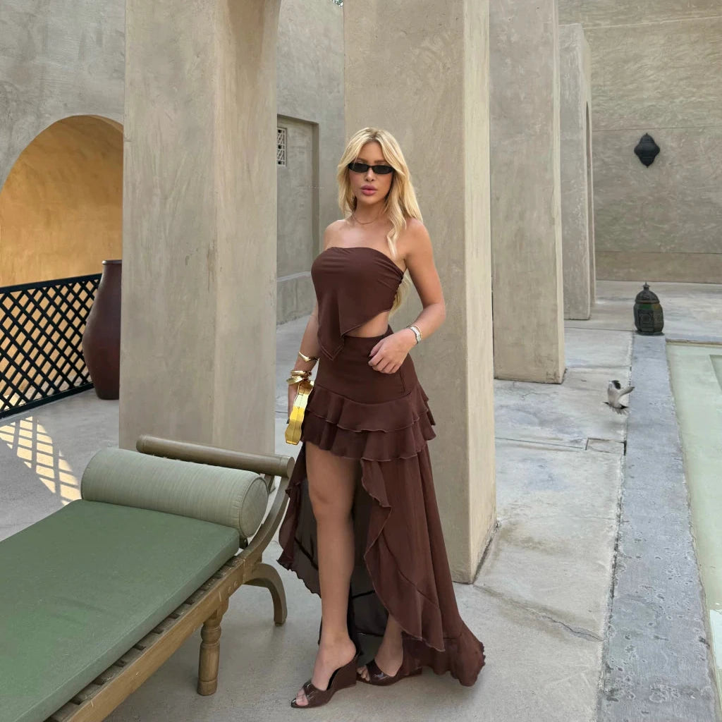 * Saia longa com camadas e fenda frontal, criando um efeito esvoaçante e um caimento impecável.