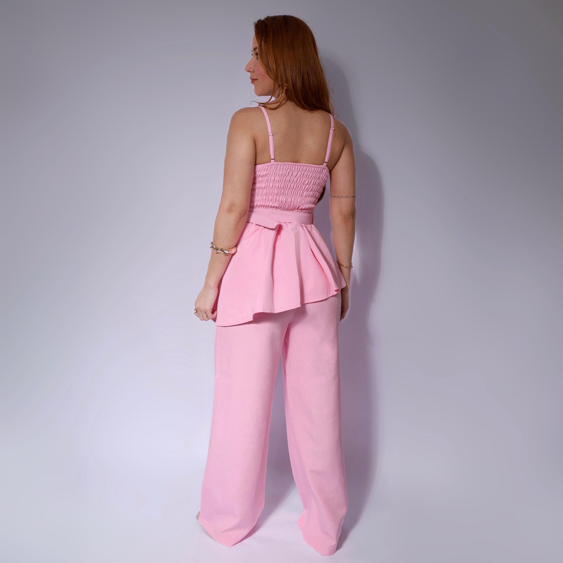 Modelagem: Blusa com bojo e elástico nas costas | Calça pantalona reta | Cinto e botões forrado