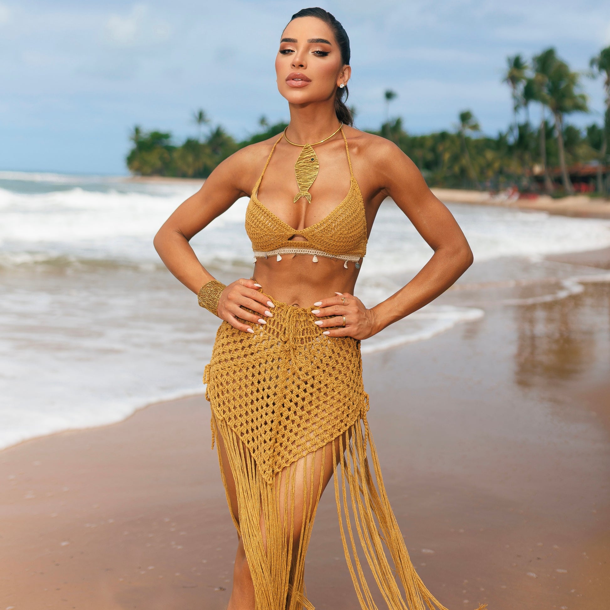 O Trijunto Artesanal Caribe é a essência do verão sofisticado. Cada detalhe foi pensado para entregar beleza, sensualidade e riqueza — do crochê 100% artesanal às aplicações de búzios bordados à mão, que transformam a peça em arte viva.